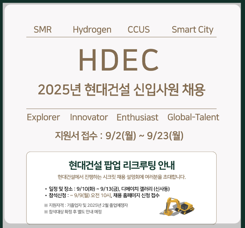 안녕하세요, 현대건설에서 2025년 신입사원 채용 소식을 전해드립니다. 이번 신입사원 채용에 관심 있으신 분들을 위해 세부 정보를 제가 직접 분석하여 정리했습니다. 9.23(월) 오후 5시 마감기한 잘 지키셔서 합격하시길 바랍니다.