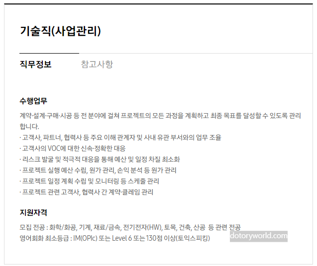 기술직 (사업관리) 화공, 기계, 재료/금속, 전기전자, 토목, 건축, 산업공학 계약·설계·구매·시공 등 전 분야에 걸쳐 프로젝트의 모든 과정을 계획하고 최종 목표를 달성할 수 있도록 관리