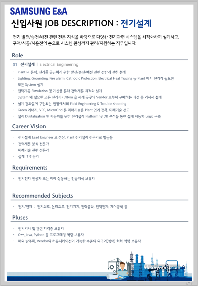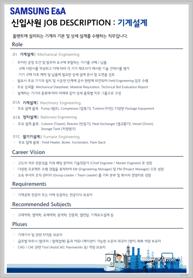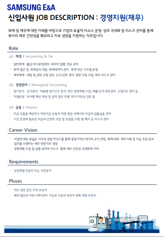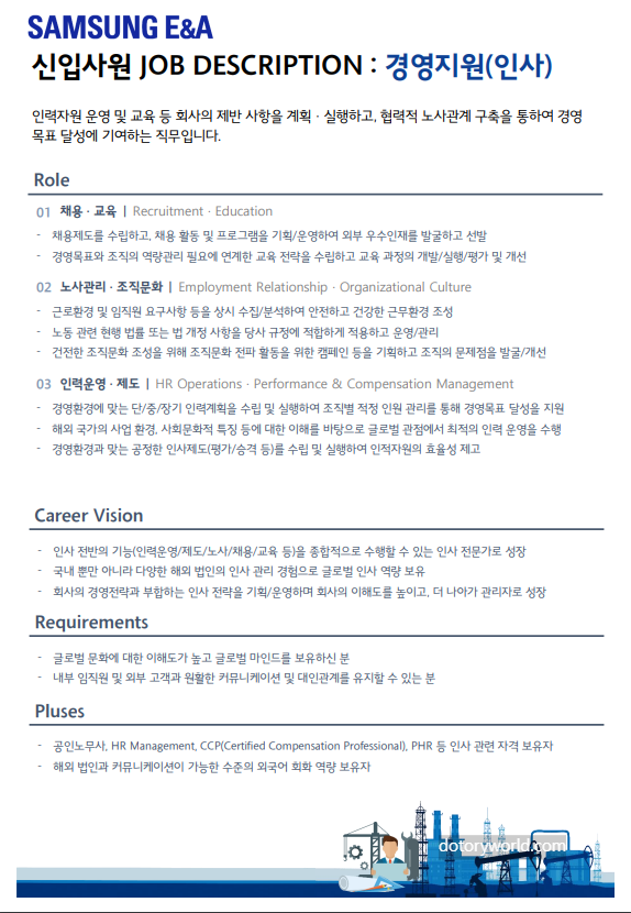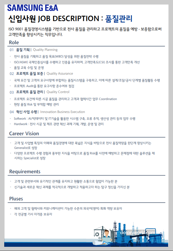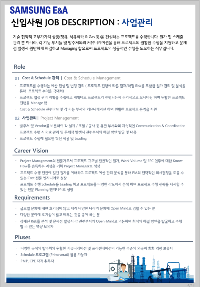 다른 회사들과 달리 삼성 그룹사는 채용 직무에 대한 명확한 정의를 [직무소개서]로 정의합니다. 2024년 하반기 삼성E&A 채용에도 역시 직무소개서가 제공되었네요. 자세히 알아보겠습니다.