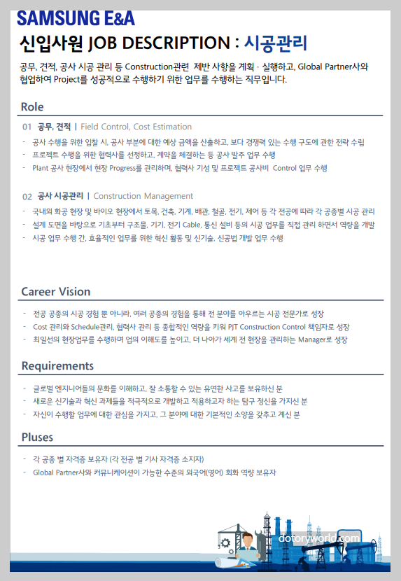 2024년 하반기 삼성 채용이 시작되었습니다. 오늘은 삼성E&A (구 삼성엔지니어링) 채용 공고를 EPC 건설사 현직자의 입장에서 직접 분석하겠습니다. 설계, 시공직부터 경영지원 까지 모든 직무의 직무소개서도 정리하였습니다. 지원서 마감이 9.11(수) 오후 5시 이므로 기한을 잘 지켜서 제출하시기 바랍니다.