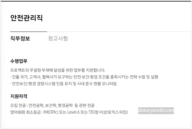 안전관리직 안전공학, 보건학, 환경공학 프로젝트의 안전·보건·환경 전략을 수립 및 실행하며 무재해·무사고 달성을 위한 업무 지원