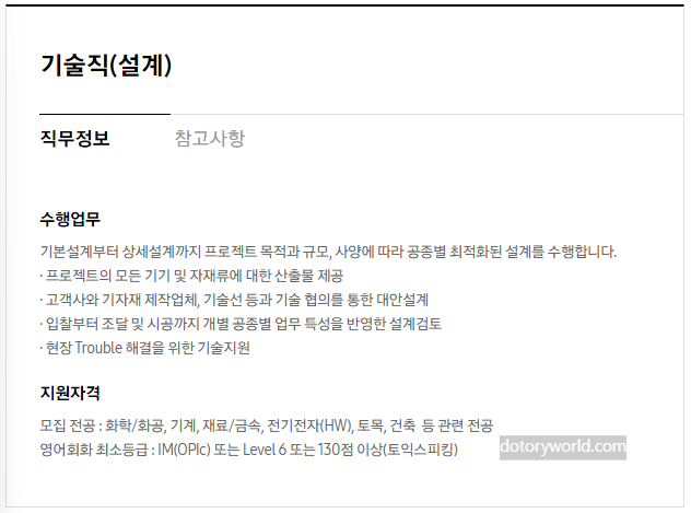 | 기술직 (설계) | 화공, 기계, 재료/금속, 전기전자, 토목, 건축 | 기본설계부터 상세설계까지 프로젝트 목적과 규모, 사항에 따른 공정별 최적화 설계 수행 |