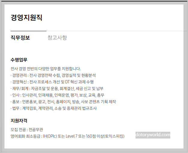 | 경영지원직 | 전공무관 | 전사 경영 전반의 다양한 업무 수행 (재무·금융·인사·경영관리·홍보 등) |