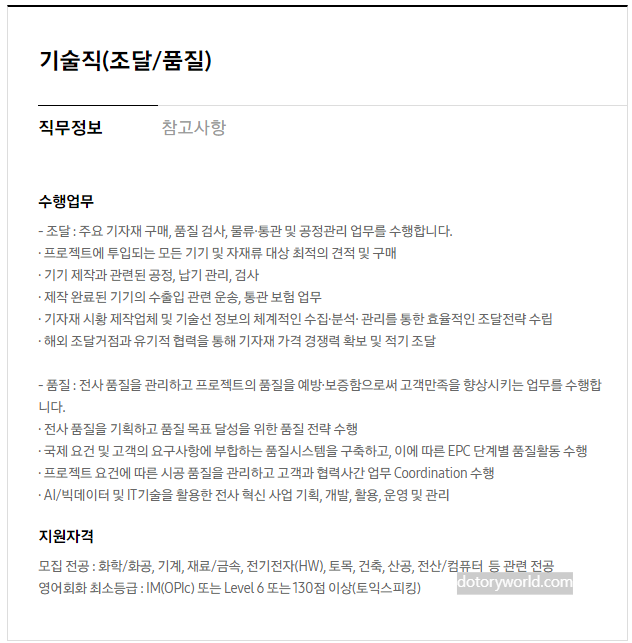 | 기술직 (조달/품질) | 화공, 기계, 재료/금속, 전기전자, 토목, 건축, 산업공학, 컴퓨터공학 | (조달)주요 기자재 구매, 품질 검사, 물류·통관 및 공정관리 업무 수행 |