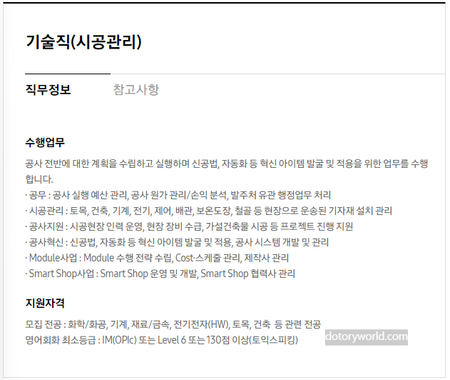 | 기술직 (시공관리) | 화공, 기계, 재료/금속, 전기전자, 토목, 건축 | 공사 전반에 대한 계획을 수립하고 실행하며, 신고법, 자동화 등 혁신 아이템 발굴 및 적용을 위한 업무 수행 |
