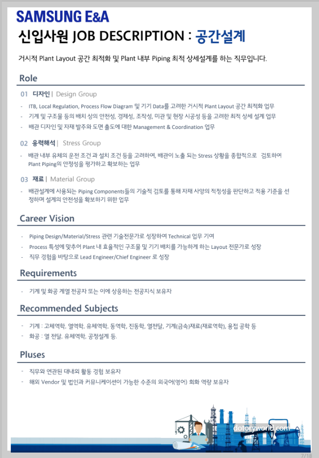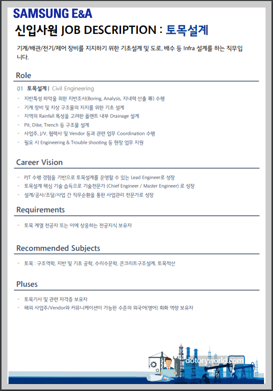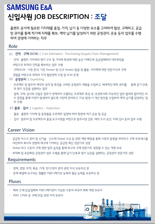 다른 회사들과 달리 삼성 그룹사는 채용 직무에 대한 명확한 정의를 [직무소개서]로 정의합니다. 2024년 하반기 삼성E&A 채용에도 역시 직무소개서가 제공되었네요. 자세히 알아보겠습니다.