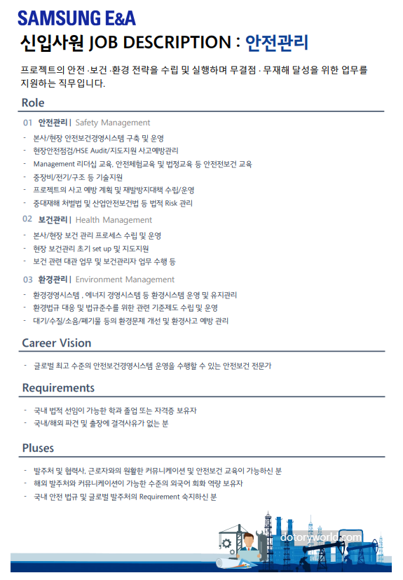 | 안전관리직 | 안전공학, 보건학, 환경공학 | 프로젝트의 안전·보건·환경 전략을 수립 및 실행하며 무재해·무사고 달성을 위한 업무 지원 |