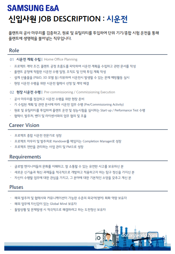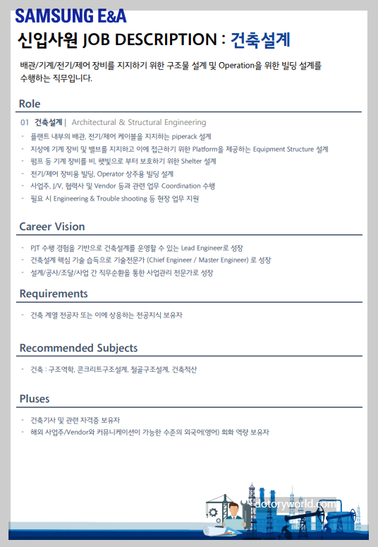 2024년 하반기 삼성 채용이 시작되었습니다. 오늘은 삼성E&A (구 삼성엔지니어링) 채용 공고를 EPC 건설사 현직자의 입장에서 직접 분석하겠습니다. 설계, 시공직부터 경영지원 까지 모든 직무의 직무소개서도 정리하였습니다. 지원서 마감이 9.11(수) 오후 5시 이므로 기한을 잘 지켜서 제출하시기 바랍니다.