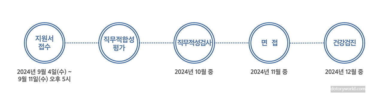 - 전형 일정: 지원서접수 (9월 11일 오후 5시) → 직무적합성평가 → 직무적성검사(10월 중) → 면접(11월 중) → 건강검진(12월 중) → 입사