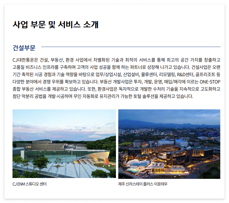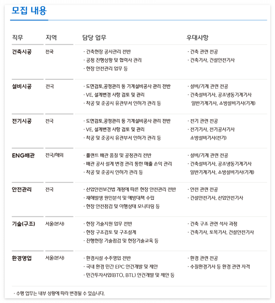 CJ대한통운 건설부문에서는 4개의 직무(건축시공/ 전기시공/ 설비시공/ 안전관리)에 대해 직무설명이 되어있습니다. 현직자 입장에서 내용을 보면 인사담장자 요청에 의해 현장의 시공 직원이 직접 작성한 것으로 보입니다. 아래 글을 잘 읽으셔서 직무에 대한 이해를 높이시고, 자소서 작성 시에 해당 문구들을 활용하시길 추천드립니다. 더욱 풍성한 글이 될 것입니다. (다만, 안전관리 제외하고는 시공직무의 일반적인 서술로 보입니다.)