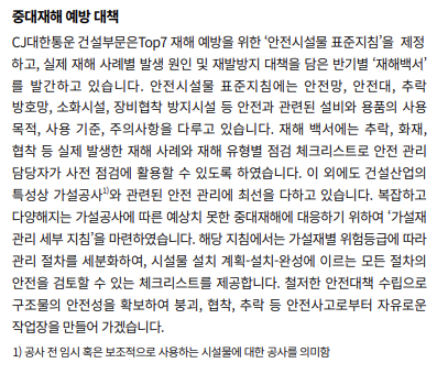 ESG 평가 측면에서 건설부문의 안전 리스크를 언급하고있음. 일정규모 이상 현장에서는 '사전안전성 평가제도'를 시행중이라고 합니다.