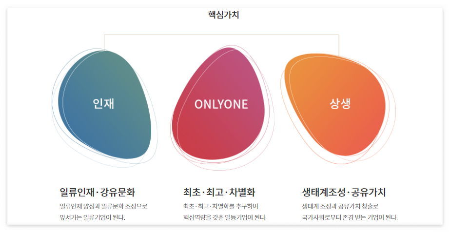 ONLYONE: 최초·최고·차별화 ► 최초·최고·차별화를 추구하여 핵심역량을 갖춘 일등기업이 된다.