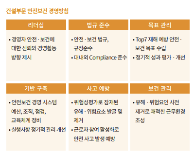 건설부문 안전보건 경영방침 에서 6가지 관리목표를 제시하고 있습니다. 'Top7 재해' 키워드도 숙지하시길 바랍니다.