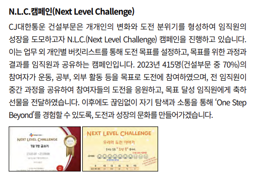 경영진과 대화할 수 있는 '타운홀 미팅'을 마련하여 매 2년씩 진행중이며, N.L.C 캠페인을 통해 개인의 성장 도모합니다.
