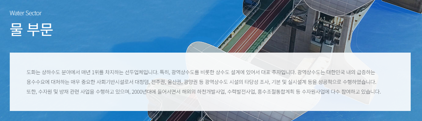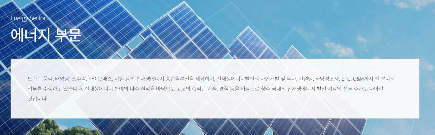 도화엔지니어링은 물/ 도시/ 교통/ 에너지 4개 분야에서 사업을 하는 회사입니다.