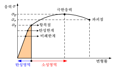 - 항복강도: 탄성 변형의 최대치 → 변형되지만 원래 상태로 복구 가능