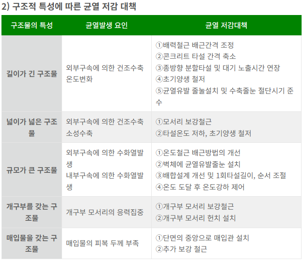 - 위에 여러가지 균열들을 소개했으나 가장 큰 비중을 차지하는 것은 시공적 요인에 의한 균열이다. 물론 재료, 환경적 요인에 의한 균열도 자주 접할 수 있는 균열이다. 재료적 요인 및 시공 시 부주의로 인하여 발생하는 균열은 현장에서 품질관리 활동을 제대로 하여 상당수 저감할 수 있다.
