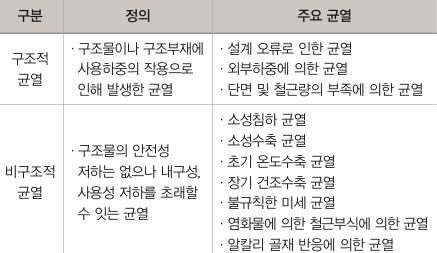균열은 구조적인 균열과 비구조적인 균열로 크게 구분할 수 있다. 구조적인 균열은 구조적 기능을 상실하거나 구조물의 안전성에 영향을 줄 수 있는 균열을 의미한다. 반면, 비구조적인 균열은 일반적으로 발생하는 형태이지만, 이를 방치하면 철근 부식이 진행될 가능성이 있어 주의가 필요하다.