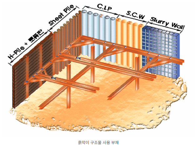 흙막이 공법에는 다양한 종류가 있는데, 목적은 모두 수직으로 흙을 파내고 지하구조물을 축조하기 위한 것이다. 이후 가로 철골 구조인 스트러트를 통해 흙막이 사이를 지지한다. (아래 사진 참고) 작업 공간의 제약이 많아 어스앵커 공법이 대안으로 활용되기도 한다.