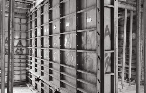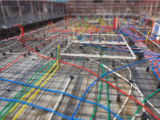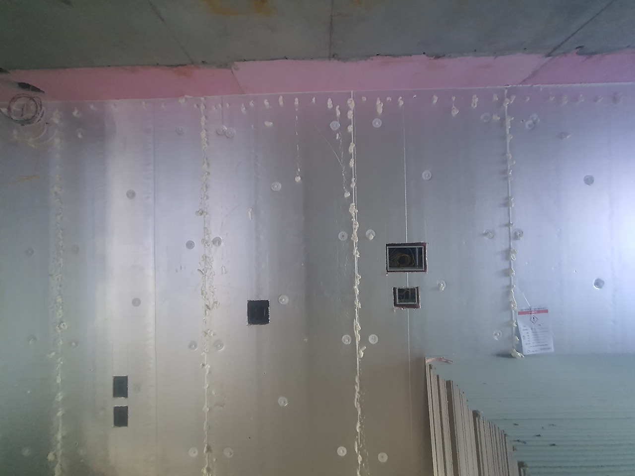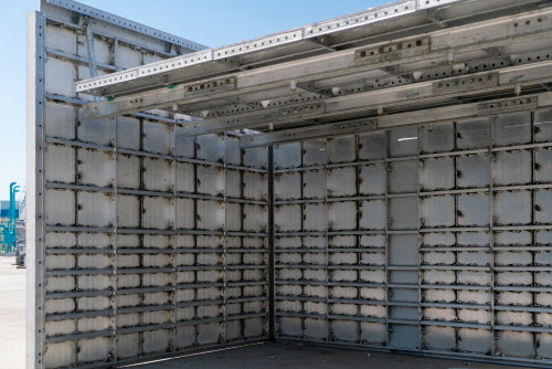 벽체 알폼 설치 및 설비 배관 배치: 이후 벽체 알폼(알루미늄으로 된 거푸집)을 설치하고 전선 같은 설비들도 설치한다.