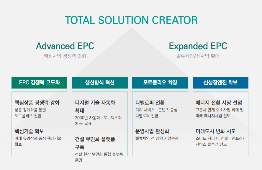 국내 초대형 정비사업을 통한 시장 주도, 하이테크, 친환경 인프라 투자 확대, 스마트 건설, 신재생 에너지 사업 강화를 핵심전략으로 내세우며 지속가능한 성장을 도모하고 있습니다.