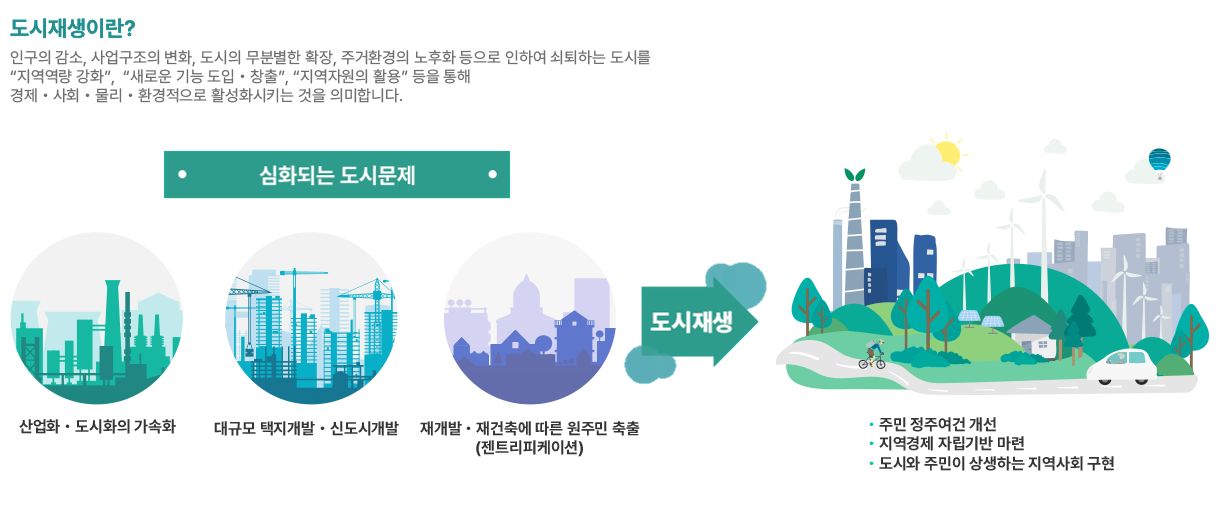 - 도시재생 혁신지구 사업: 지역 거점을 조성하고, 창업·산업 지원시설을 마련하여 지역 경제를 활성화하는 사업입니다.