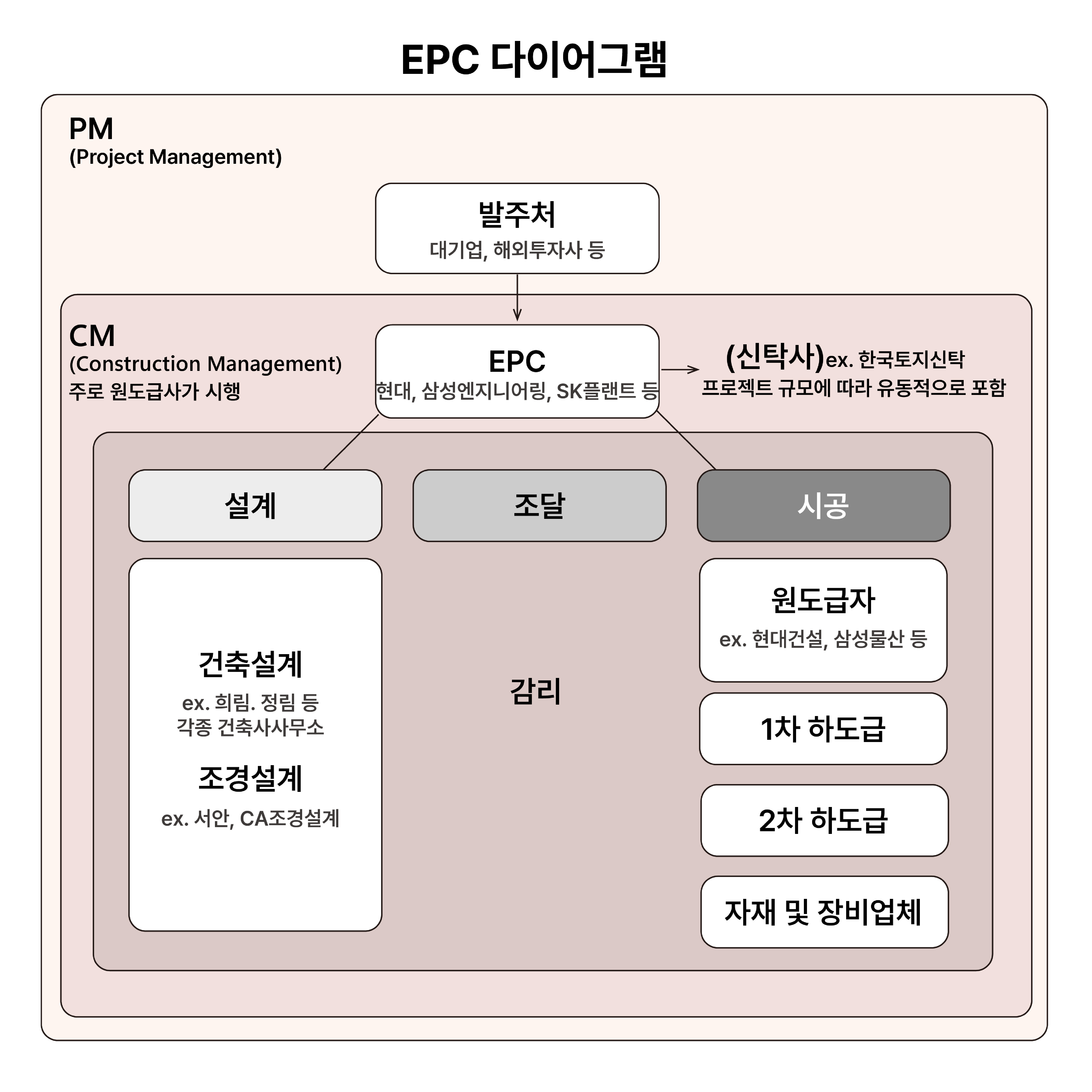 - 공공사업은 정부(공공기관)가 발주하고 조달청이 시공사를 선정하지만, EPC는 민간 발주처가 한 기업(EPC사)에 사업 전체를 맡겨요.