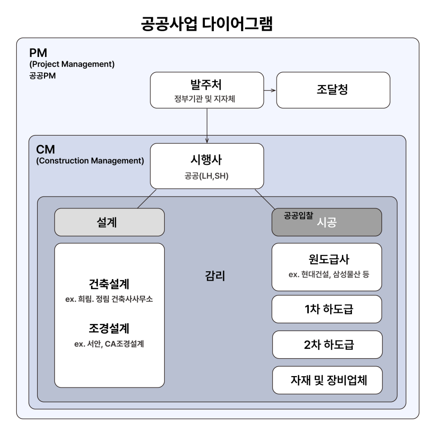 건설업에서 자주 듣는 발주처, 시행사, 조달청, CM, PM, 감리, 신탁...비슷한 용어 같은데 정확히 뭐가 다른지 궁금하셨죠?이번 기사에서는 여러분들이 헷갈릴만한 개념에 관해 정리해 봤습니다!