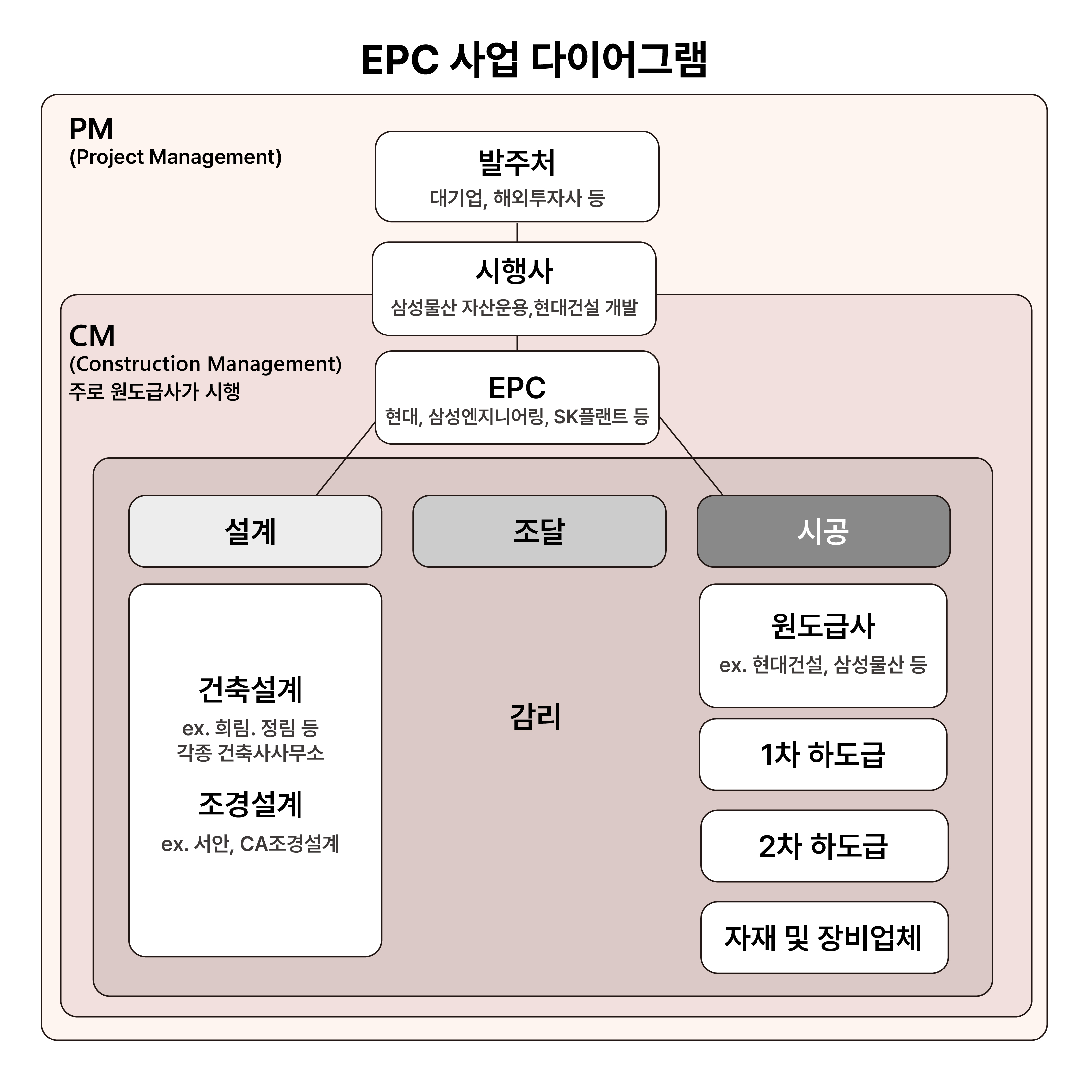 민간사업에서는 플랜트사업의 경우 EPC에서 시행사 역할부터 시공까지 턴키 방식으로 사업기획부터 건설까지 다 하는 경우가 있지만, 일반적으로는 부동산개발업체가 시행사 역할을 맡아 프로젝트를 기획, 자금 조달을 진행하고, EPC가 시공을 맡는 경우가 많아요.