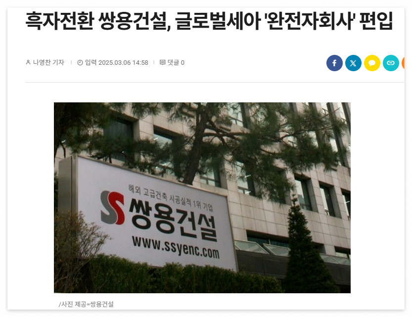 [뉴스 스크랩] 🏗 쌍용건설, 글로벌세아 완전자회사 편입!