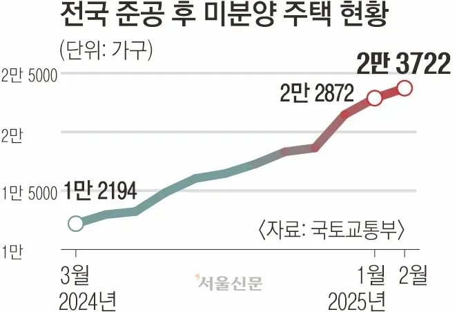 2025년 2월 기준, 전국의 준공 후 미분양 주택은 2만 3,722호로 전월 대비 3.7% 증가하며 2013년 10월 이후 11년 4개월 만에 최대치를 기록했습니다. 전체 미분양 주택 중 약 33.8%를 차지하는 이 수치는 특히 지방에서 집중적으로 나타나고 있으며, 지방 물량이 전체의 80.8%인 1만 9,179호에 달합니다. 미분양 사태에 따라 건설사, 금융사 등에게도 연쇄적인 영향을 미치고 있는데, 이에 대해서는 아래에서 다뤄보도록 하겠습니다.